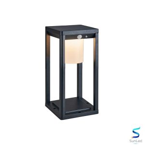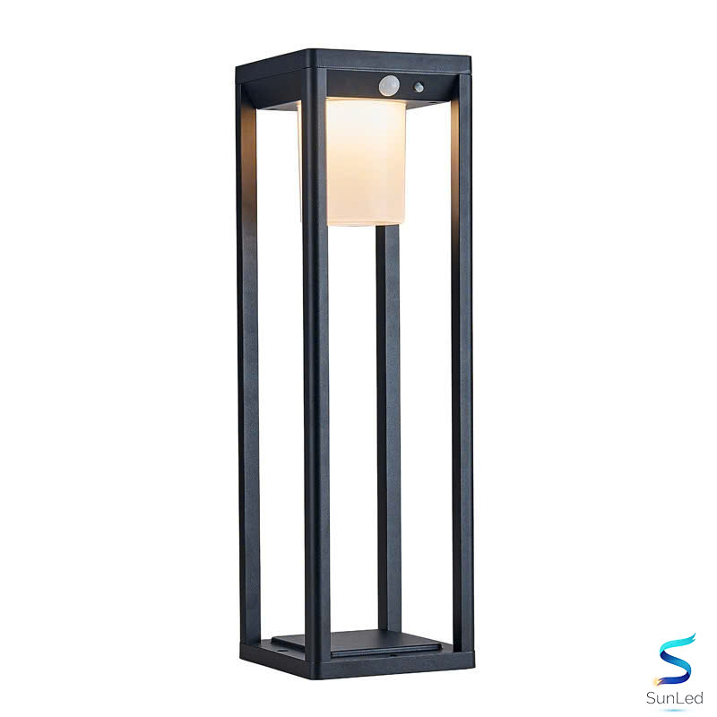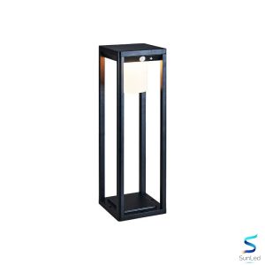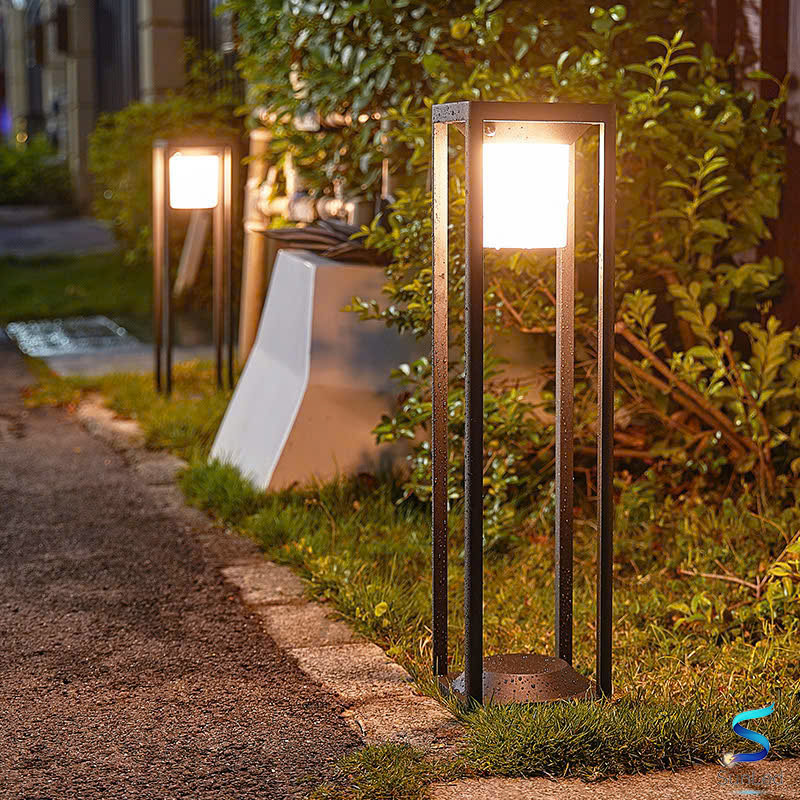 Mẫu đèn có khung kim loại vuông vức, tone đen sang trọng kết hợp chao đèn dạng hộp ánh sáng vàng/ trắng nhẹ nhàng, tạo điểm nhấn tinh tế cho khuôn viên.